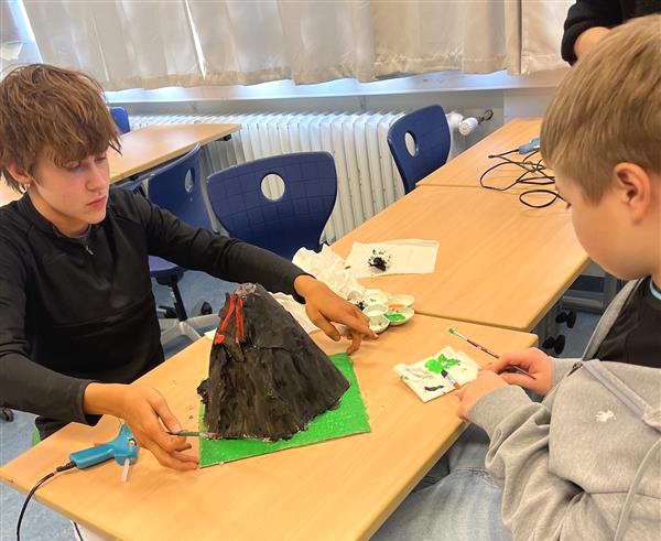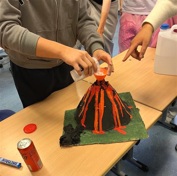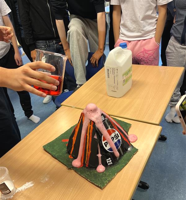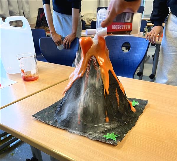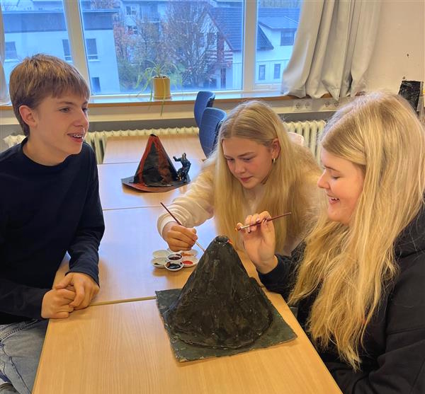 Nemendur tíunda bekkjar hafa undanfarið verið að læra efnafræði. Þau hafa kynnt sér lotukerfið, eignleika efna og hvernig mismunandi frumefni tengjast og mynda ný efni. Til að tengja fræðin við verklega kennslu bjuggu þau til eigin eldfjall. Nemendum var skipt í hópa, föndruðu fjallaðið með flösku í miðju fjallsins og blönduðu saman matarsóda, ediki og matarlit. Við það gýs, það myndast gas og vökvi gusast upp úr fjallinu.