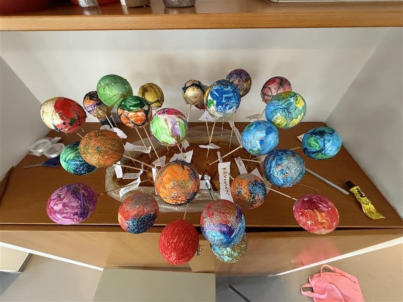 Nemendur fyrsta og annars bekkjar útbjuggu sólkerfið okkar lærðu um reikistjörnurnar okkar í röð frá sólu. Viðfangsefnið var tengt við Byrjendalæsi þar sem orðið reikistjarna var lykilorð og unnið með orðasúpur úr geimorðum. Sömuleiðis hönnuðu nemendur sinn eigin geimfara með mynd af sér í geimskipi. Við komumst skammt án stjórnborðs og því þurfti að smíða mismunandi útgáfur af því.