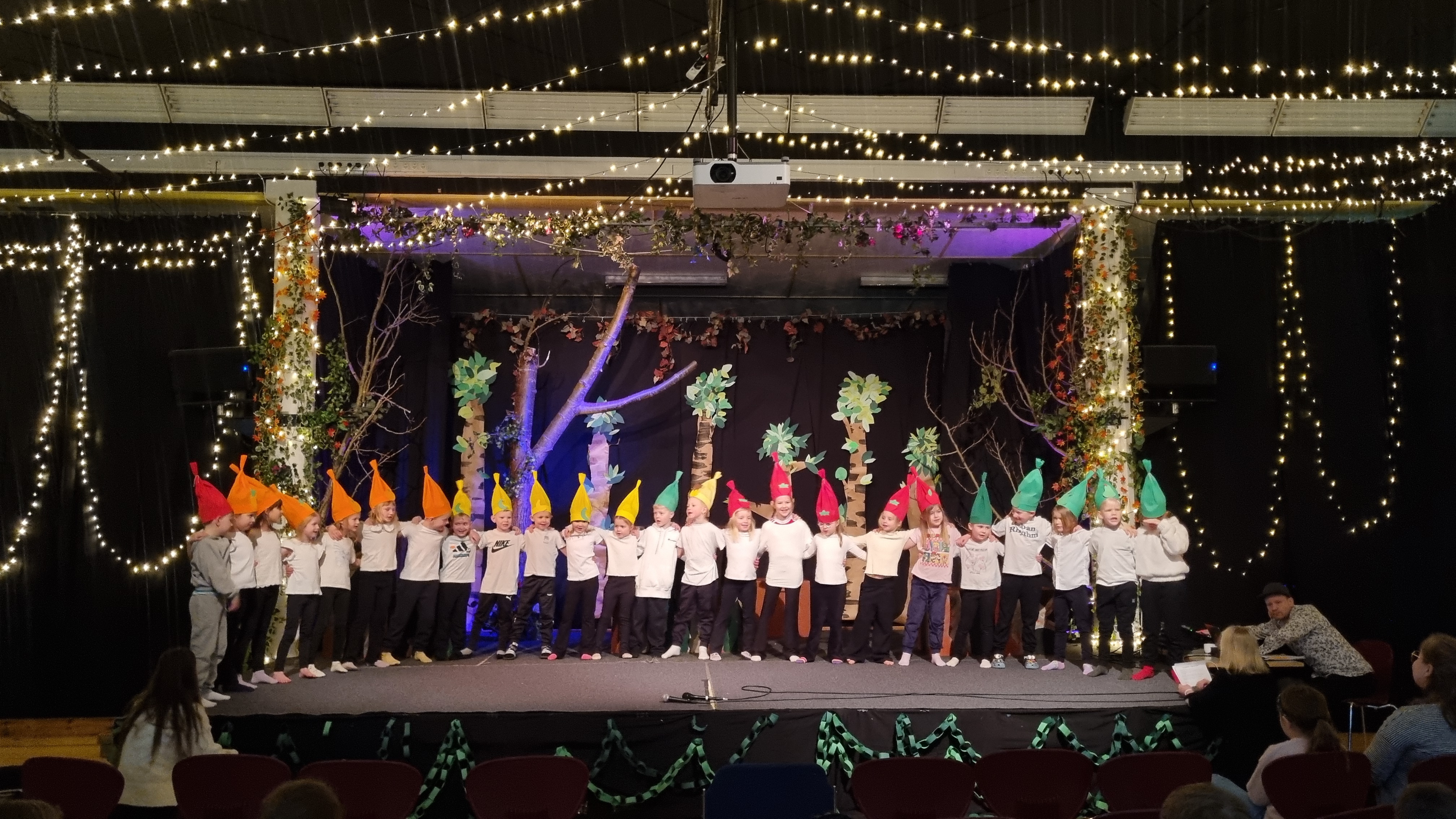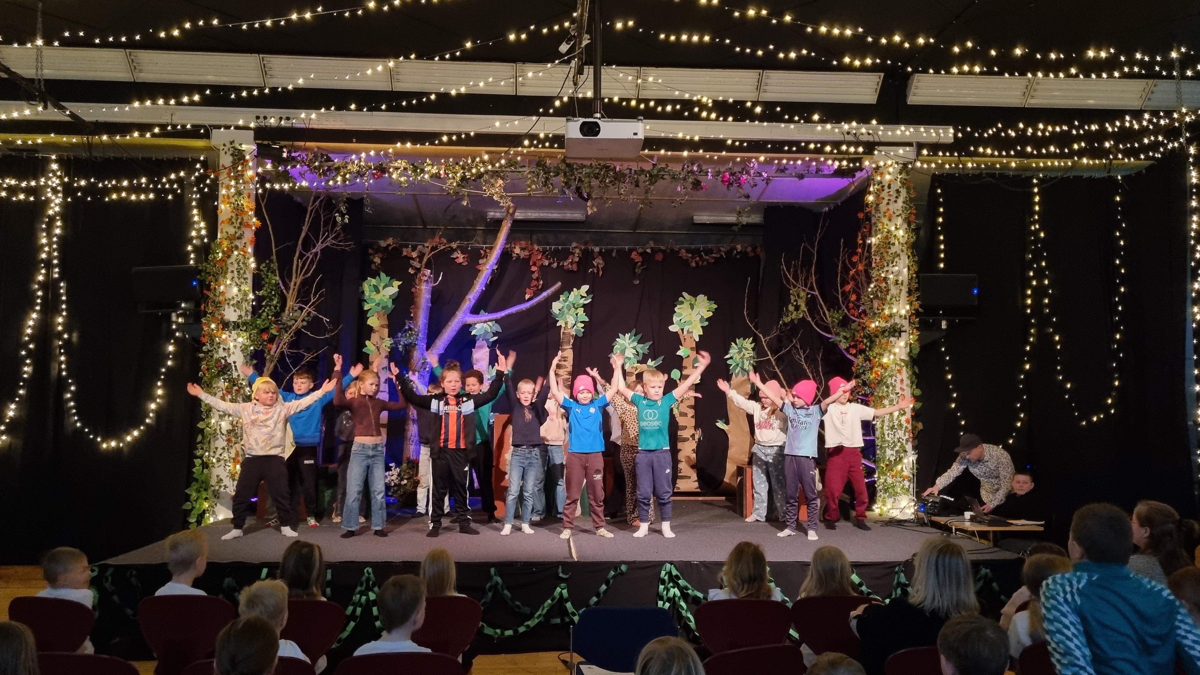 Nemendur í þriðja bekk dönsuðu valda dansa við lagaspyrpu og nemendur úr fimmta bekk spiluðu og sungu í upphafi samkomunnar. Stærsta atriðið á samkomunni venju samkvæmt er leikrit sjöunda bekkjar.