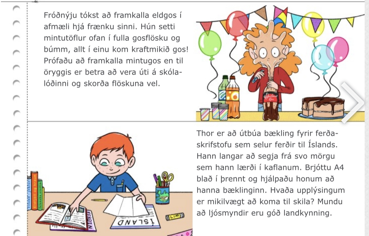 Lokahnykkur í þemanu var að útbúa bækling hvar nemendur merktu inn á kort, framkvæmdu tilraunir með myntutöflum, matarsóda og gosi. Verkefnið var mjög skemmtilegt og fræðandi og tengist tíðum eldgosum á Íslandi.